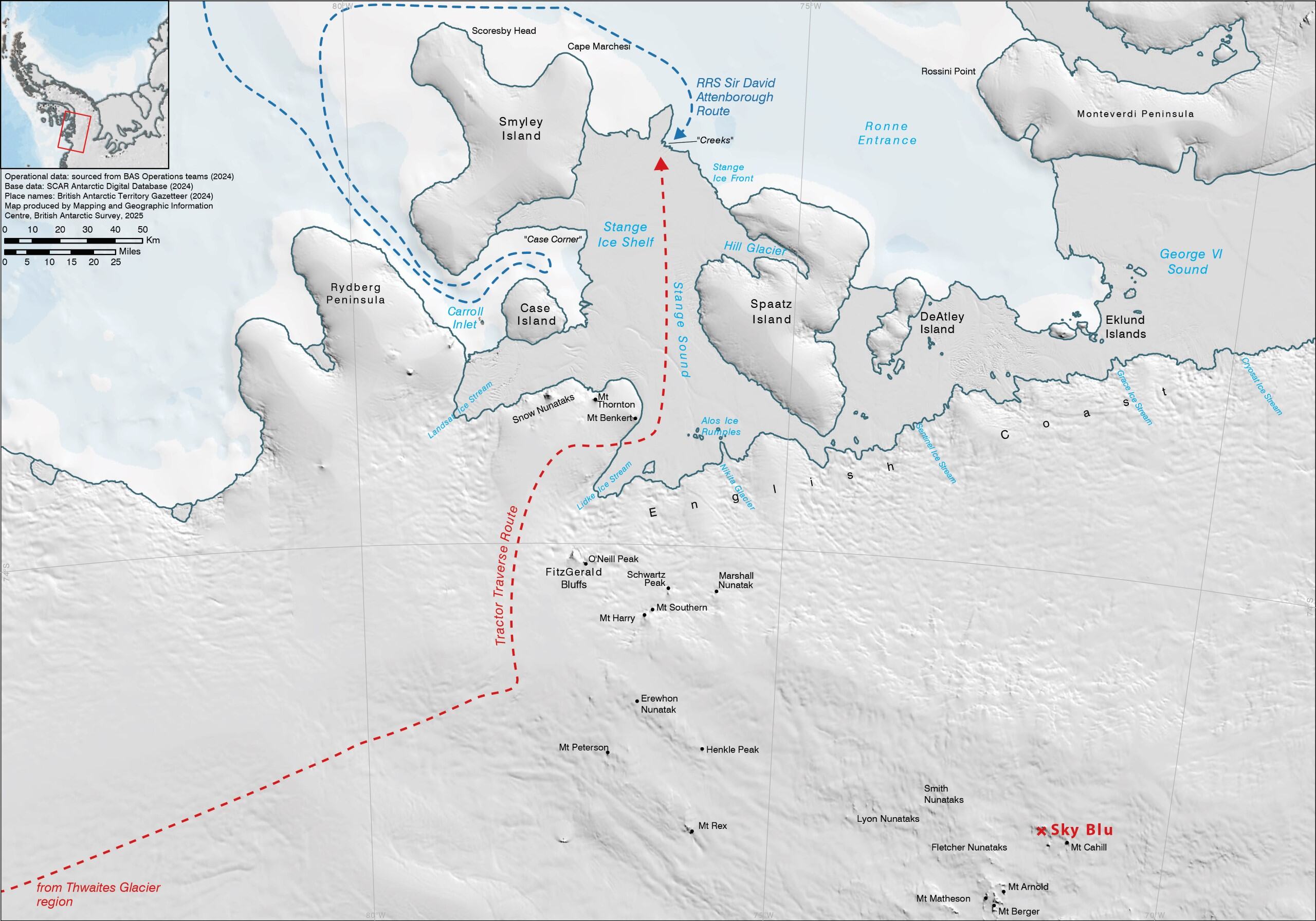 The plan required success from three teams: a ground crew driving a convoy of vehicles – a tractor traverse – hauling equipment across the icy landscape; Royal Research Ship Sir David Attenborough (SDA) cutting through sea ice to find a suitable location to moor the ship at the shelf edge; and ski-equipped BAS Twin Otter aircraft supporting the whole operation. Each faced their own battle against the elements, with success depending both on expertise and good fortune in one of Earth’s most unforgiving environments.