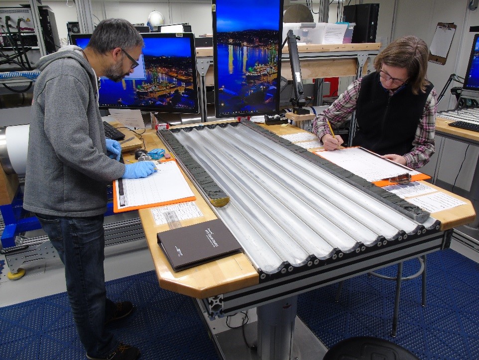 After the visual description the sedimentologists scan the archive halves for sediment colour and magnetic properties (i.e. the content of minerals that can be magnetised) before handing them over to the palaeomagnetics specialists. These researchers investigate the cores for past reversals of the Earth’s magnetic field, which are recorded in the sediments. Because the ages of these reversals are well known, the measurements help to identify the time when the sediments were deposited.