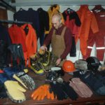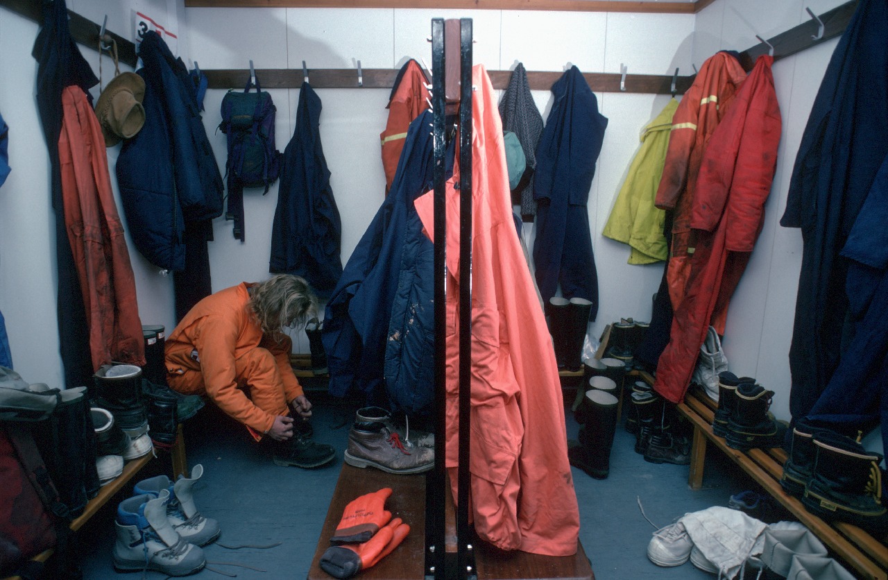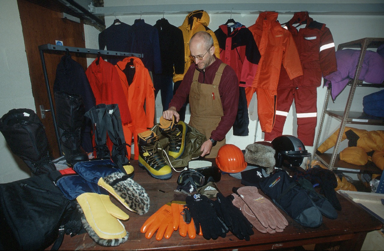 Clothing Antarctic Clothing Pictures Footwear, L-R , RBLT, Rigger boot, Plastic Field Boot, Mukluk, Leather Field Boot, Wellington Boot. Everyone gets kitted out before travelling to the polar regions