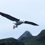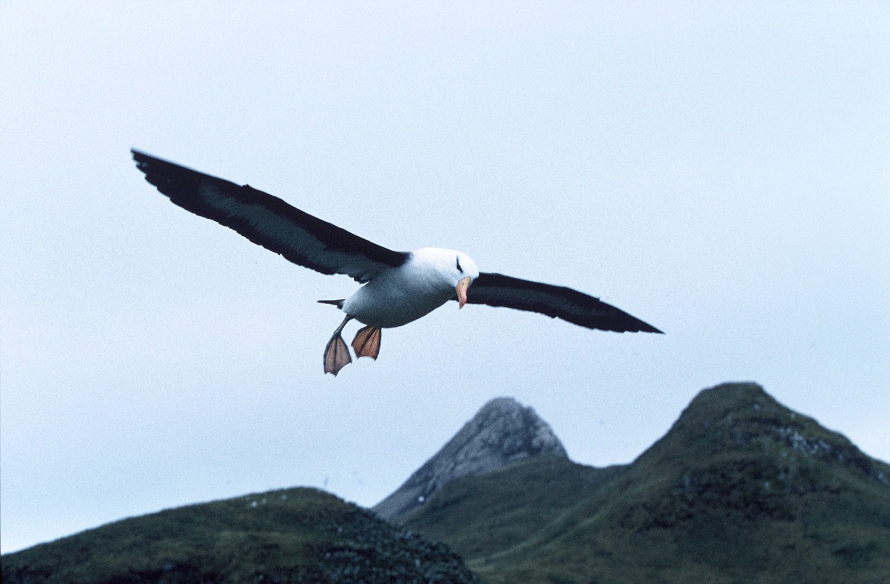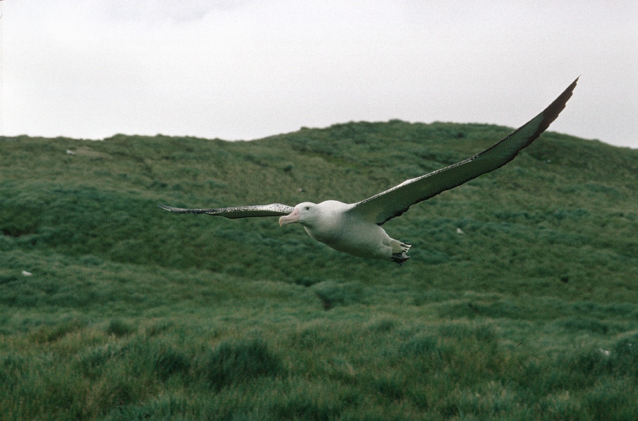 Wandering Albatross (Diomedea exulans) in flight over Top Meadows, Bird Island. Having such large wings makes take-off and landing from grassy slopes often appear very clumsy.