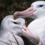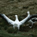 A pair of Wandering albatrosses displaying during a courtship ritual at a study site on Bird Island, South Georgia. British Antarctic Survey scientists have confirmed a steady decline in the albatross population on Bird Island, probably as a result of drowning when their beaks catch on baited fish hooks.