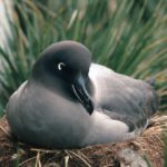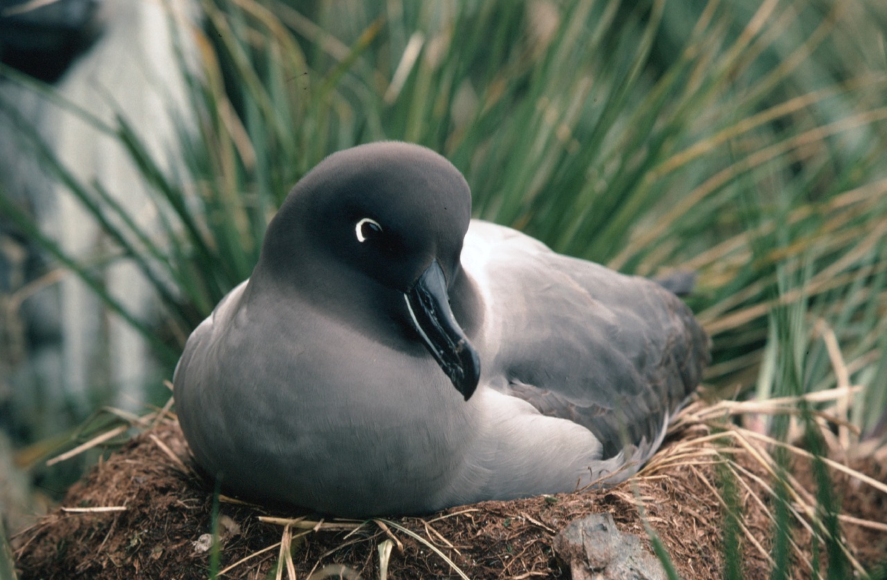 Light-Mantled Sooty Albatross (Phoebetria palpebrata) on a nest overlooking Johnson Cove at the end of Molly Ridge, Bird Island, South Georgia