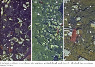 Geothermal energy provides an important resource in Antarctic marine ecosystems, exemplified by the recent discovery of large-sized chemosymbiotic vesicomyid bivalves (subfamily Pliocardiinae) in the Southern Ocean. These clams, which we identified as Archivesica s.l. puertodeseadoi, have been reported as dead shells in areas previously covered by Larsen A and B ice shelves (eastern Antarctic Peninsula) and as live animals from active hydrothermal sites in the Kemp Caldera (South Sandwich Arc) at depths of 852–1487 m. Before, A. puertodeseadoi was known only from its type locality in the Argentine Sea, so we considerably extend the range of the species. Observations taken by remotely operated vehicle (ROV) footage show that the clams can live buried in sediment, or epilithically on the surface of rocks in diffuse geothermal flow. Experimental respirometry was conducted at surface pressure on individual bivalves acclimated to either their habitat temperature (4 °C) or elevated temperature (10 °C). The range of standard metabolic rates, from 3.13 to 6.59 (MO2, μmol O2 h−1 g−1 dry tissue mass), is similar to rates measured ex situ for other species in this clade, and rates did not differ significantly between temperature groups. Taken together, these data indicate a range of ecophysiological flexibility for A. puertodeseadoi. Although adapted to a specialist mode of life, this bivalve exploits a relatively broad range of habitats in the Southern Ocean: within sulphidic sediments, epilithically in the presence of diffuse sulphidic flow, or in deep methane-enriched seawater trapped under ice.