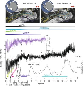 Scotia Sea and the Drake Passage is key towards understanding the development of modern oceanic circulation patterns and their implications for ice sheet growth and decay. The sedimentary record of the southern Scotia Sea basins documents the regional tectonic, oceanographic and climatic evolution since the Eocene. However, a lack of accurate age estimations has prevented the calibration of the reconstructed history. The upper sedimentary record of the Scotia Sea was scientifically drilled for the first time in 2019 during International Ocean Discovery Program (IODP) Expedition 382, recovering sediments down to ∼643 and 676 m below sea floor in the Dove and Pirie basins respectively. Here, we report newly acquired high resolution physical properties data and the first accurate age constraints for the seismic sequences of the upper sedimentary record of the Scotia Sea to the late Miocene. The drilled record contains four basin-wide reflectors – Reflector-c, -b, -a and -a' previously estimated to be ∼12.6 Ma, ∼6.4 Ma, ∼3.8 Ma and ∼2.6 Ma, respectively. By extrapolating our new Scotia Sea age model to previous morpho-structural and seismic-stratigraphic analyses of the wider region we found, however, that the four discontinuities drilled are much younger than previously thought. Reflector-c actually formed before 8.4 Ma, Reflector-b at ∼4.5/3.7 Ma, Reflector-a at ∼1.7 Ma, and Reflector-a' at ∼0.4 Ma. Our updated age model of these discontinuities has major implications for their correlation with regional tectonic, oceanographic and cryospheric events. According to our results, the outflow of Antarctic Bottom Water to northern latitudes controlled the Antarctic Circumpolar Current flow from late Miocene. Subsequent variability of the Antarctic ice sheets has influenced the oceanic circulation pattern linked to major global climatic changes during early Pliocene, Mid-Pleistocene and the Marine Isotope Stage 11.
