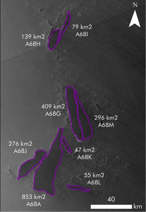 The A68a iceberg has splintered into several pieces. Copernicus Sentinel-1 image acquired on 01-02-2021 21:41:25 UTC, processed by ESA. The largest section remains over 853 square kms in size.