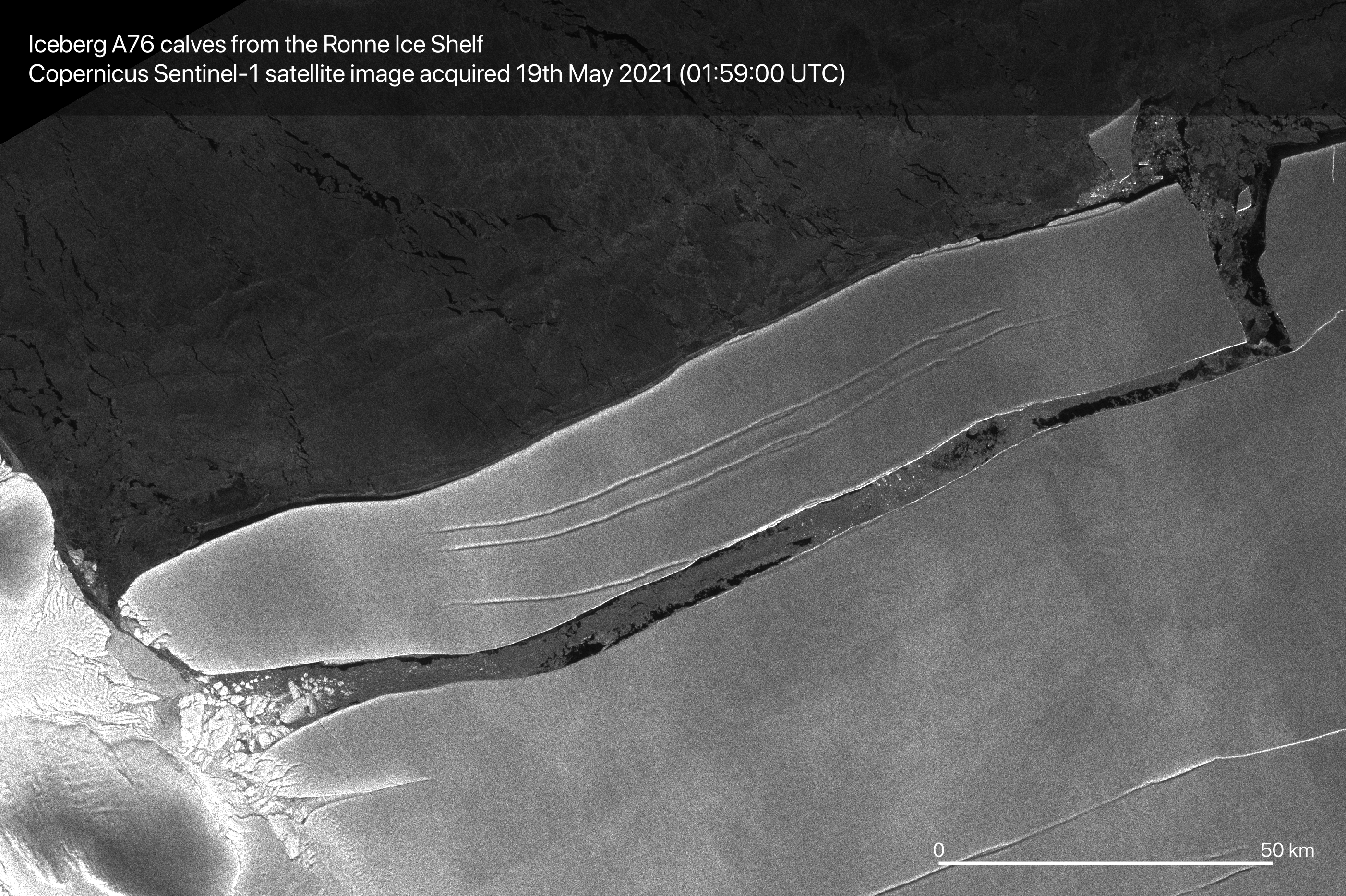 The iceberg was confirmed by the US National Ice Center using Copernicus Sentinel-1 imagery. The Sentinel-1 mission consists of two polar-orbiting satellites that rely on C-band synthetic aperture radar imaging, returning data regardless of whether it is day or night, allowing year-round viewing of remote regions like Antarctica.