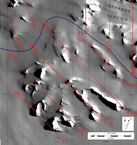Before flying the aerial photography a detailed flight plan is prepared at 1:100,000 scale showing the survey lines needed for the area and a calculation of the number of photographs. We usually use Landsat satellite imagery as the backdrop for these maps. During flight the pilot follows the flight plan, linking the lines in the most efficient way. The camera operator uses the navigation sight to check progress and tells the pilot of any adjustments needed to the aircraft track.