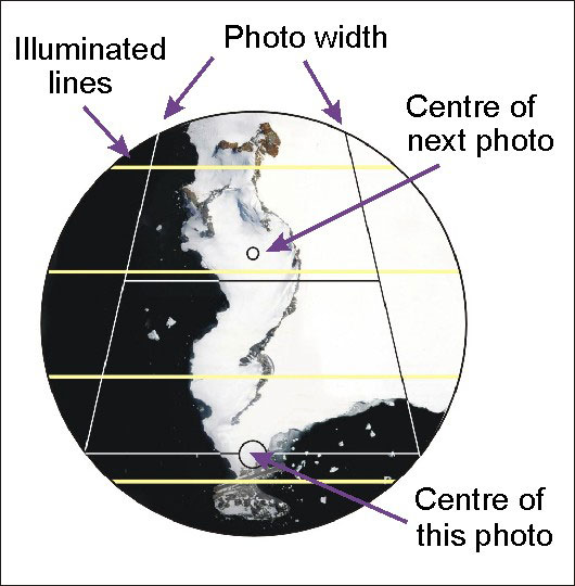 The controller uses information received from the navigation sight and the camera settings to calculate the time interval needed between successive photographs to keep full overlapping coverage.