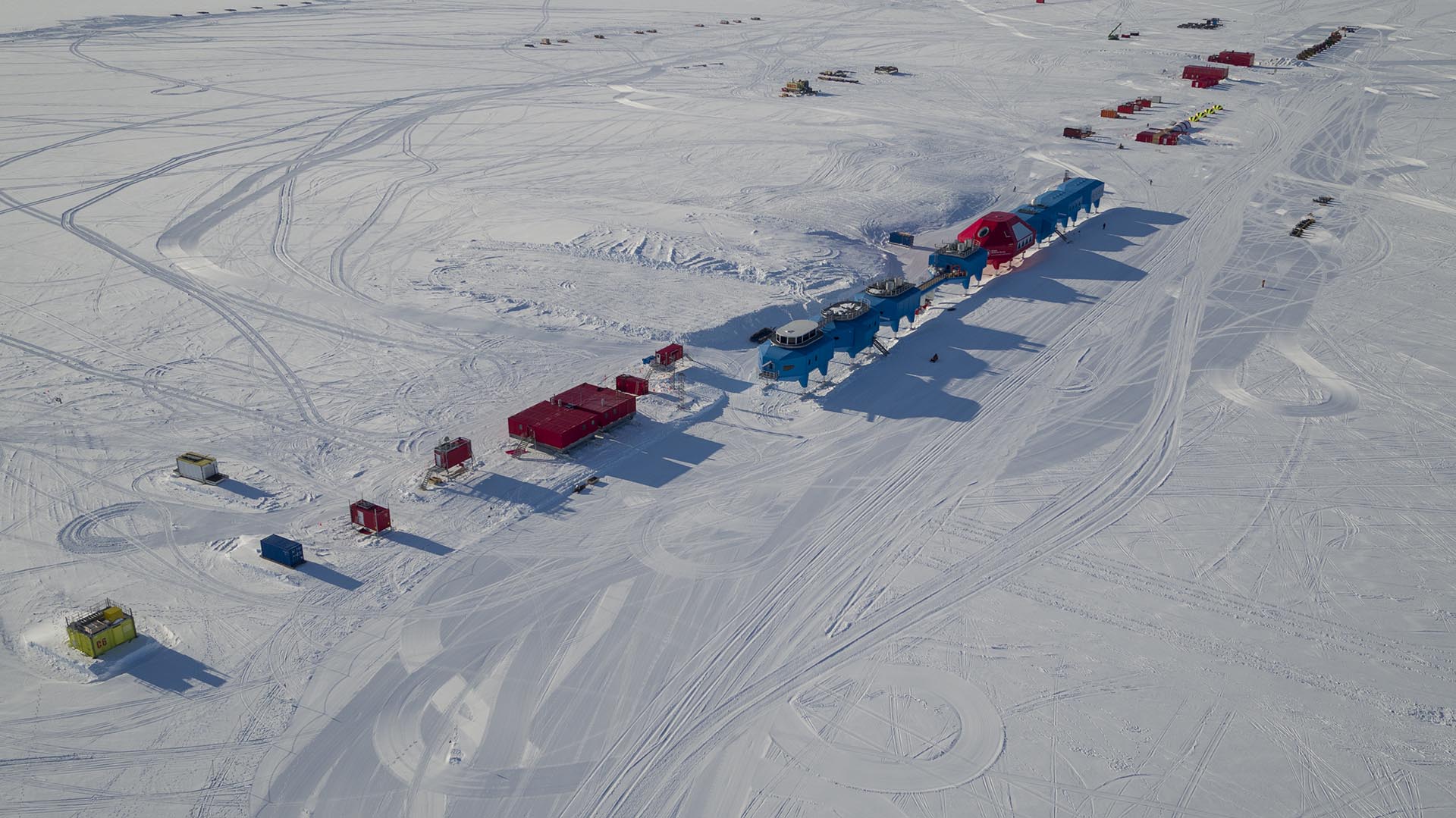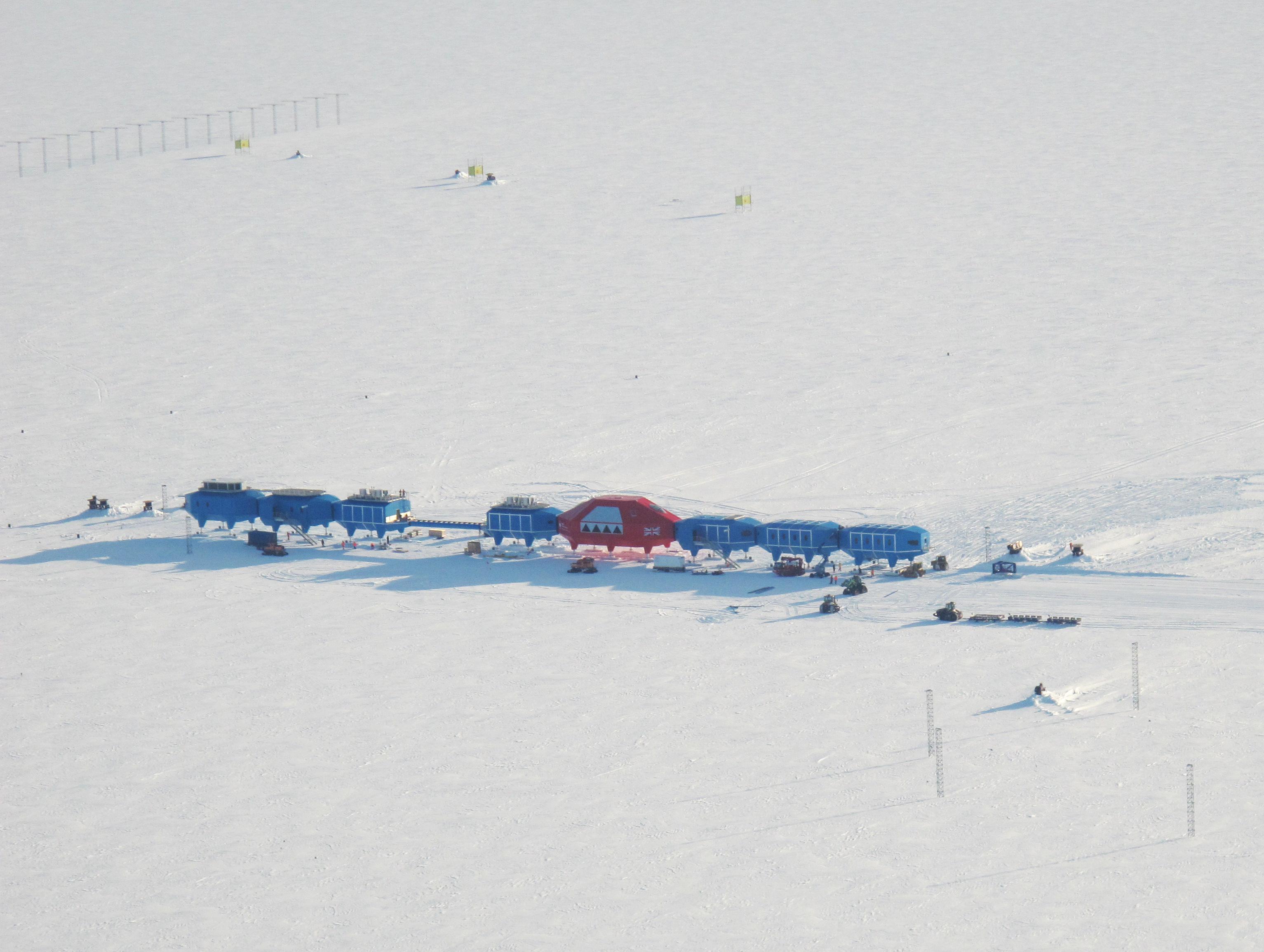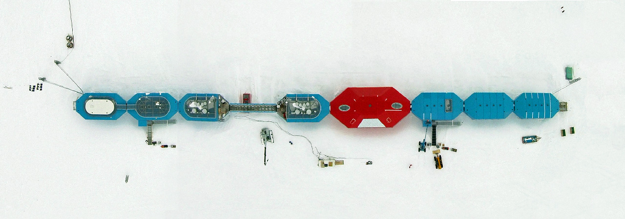 The central red module contains the communal areas for eating and socialising, while the blue modules provide accommodation, laboratories, offices, generators, an observation platform and other facilities. Halley also has a snow runway and supports a number of summer field science activities.