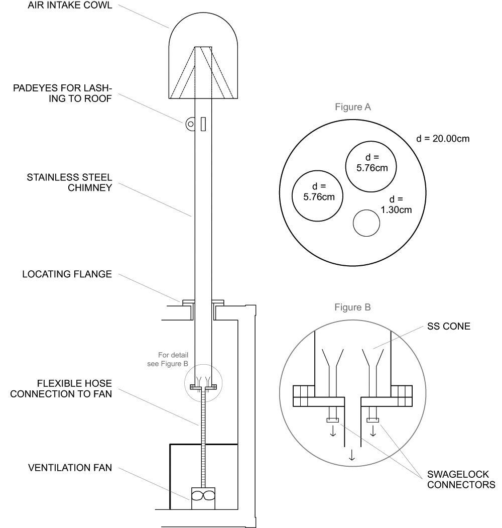 The aerosol inlet stack comprises a 200 mm i.d. stainless steel chimney with a cowl at the air intake to prevent snow ingress (see diagram below). Ventilation is achieved using a fan with a variable flow rate. The flow rate can be altered according to the volume of air being drawn from the stack by samplers, thus enabling isokinetic sampling.