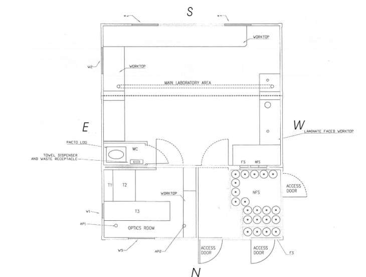 There are various locations in the walls and ceiling of the laboratory where gland plates allow penetration to the outside world. For equipment that cannot sample from the inlet stacks, dedicated inlets can be passed through the laboratory structure to equipment inside.