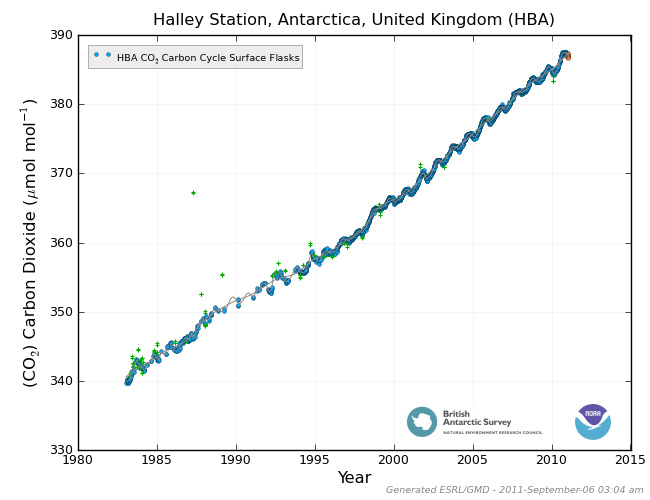 Since 1983, Halley station has contributed to the carbon cycle measurement program of the NOAA collaborative sampling network. Whole air samples are collected approximately weekly in glass flasks and returned to NOAA’s Global Monitoring Division in the US for analysis of various gases including CO2, CH4, CO, H2, SF6, N2O, 13C/12C in CO2, 18O/16O in CO2.