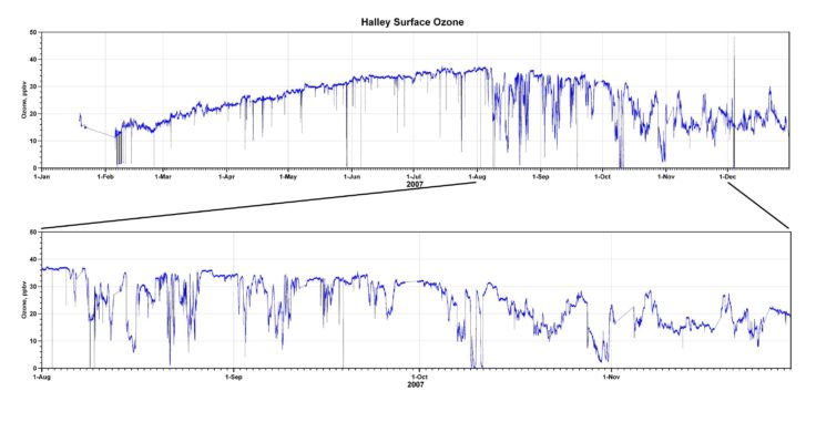 Tropospheric ozone depletion events (ODEs) are well-known phenomena that are observed in both polar regions during spring. Surface ozone drops from background concentrations to below instrumental detection limits (of a few parts per billion by volume).