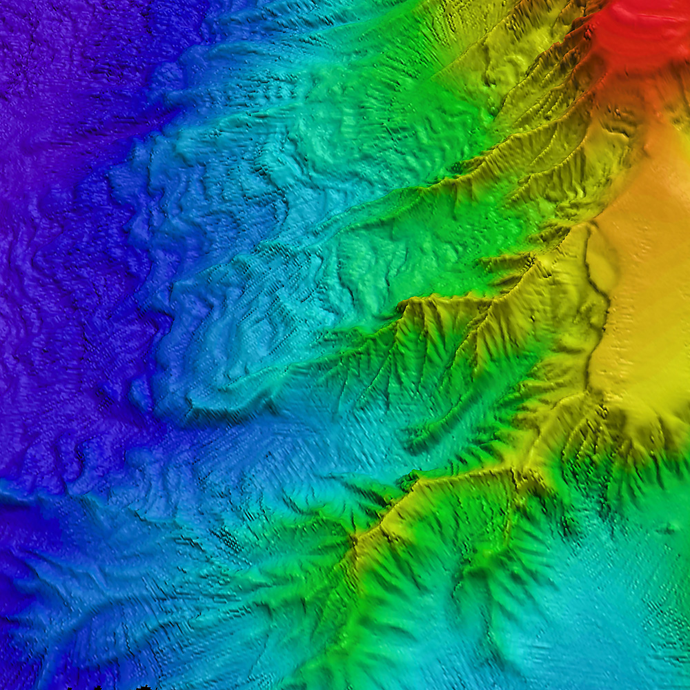 The bathymetry of the sea floor north-east of the volcanic Saunders Island in the South Sandwich Archipelago. Deeply-eroded canyons funnel sediment down the submarine slope of the volcano into deep water (shown blue).