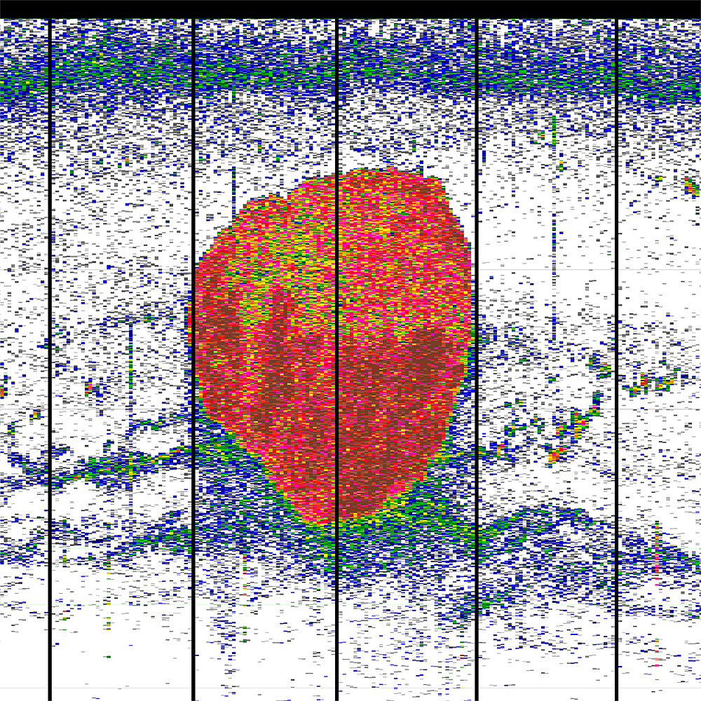 This image is an echogram, a visual representation of the quantity of sound energy reflected by objects in the sea. The redder the colour in the image, the greater the amount of sound that has been reflected, with white representing ‘empty’ water. In this case, the red strawberry shape is an Antarctic krill swarm that the ship passed over as it was heading from Signy to South Georgia. It was 100m deep and 1km long.