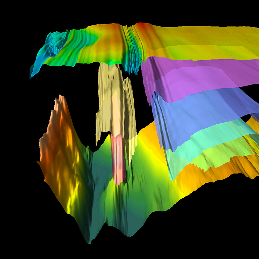 This image shows a 2km-deep cross-section of Carlson Inlet in West Antarctica. The layering is very different on the two sides of the image, to the left the layers are tightly folded and those to the right are gently undulating. This marks the difference between ice that is flowing fast (180m per year) on the left and slow (35m per year) on the right. The most intense folding is where the fast-moving ice shears past the slow ice.