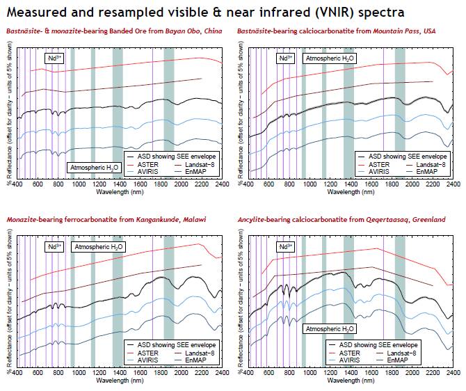 Many rare earth elements (REEs) have unique spectral properties at visible and near infrared wavelengths (VNIR: 400−1400 nm) that make them directly detectable with reflectance spectroscopy. Previous studies have indicated that neodymium (Nd) has the most diagnostic spectral features of the REEs. Although various studies have demonstrated that REE-bearing igneous complexes can be mapped using remote sensing techniques, current satellite-based multispectral instruments have rarely been able to resolve the narrow absorption features associated with REEs because of their coarse spectral resolutions. However, the improved spectral resolution in planned hyperspectral instruments, such as EnMAP, may enable REEs to be detected directly from satellite-based platforms in future.